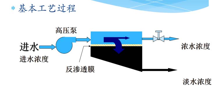反渗透又称逆渗透,是一种以压力差为推动力,从溶液中分离出溶剂的膜分离操作。对膜一侧的料液施加压力,当压力超过它的渗透压时,溶剂会逆着自然渗透的方向作反向渗透。从而在膜的低压侧得到透过的溶剂,即渗透液;高压侧得到浓缩的溶液,即浓缩液。若用反渗透处理海水,在膜的低压侧得到淡水,在高压侧得到卤水。